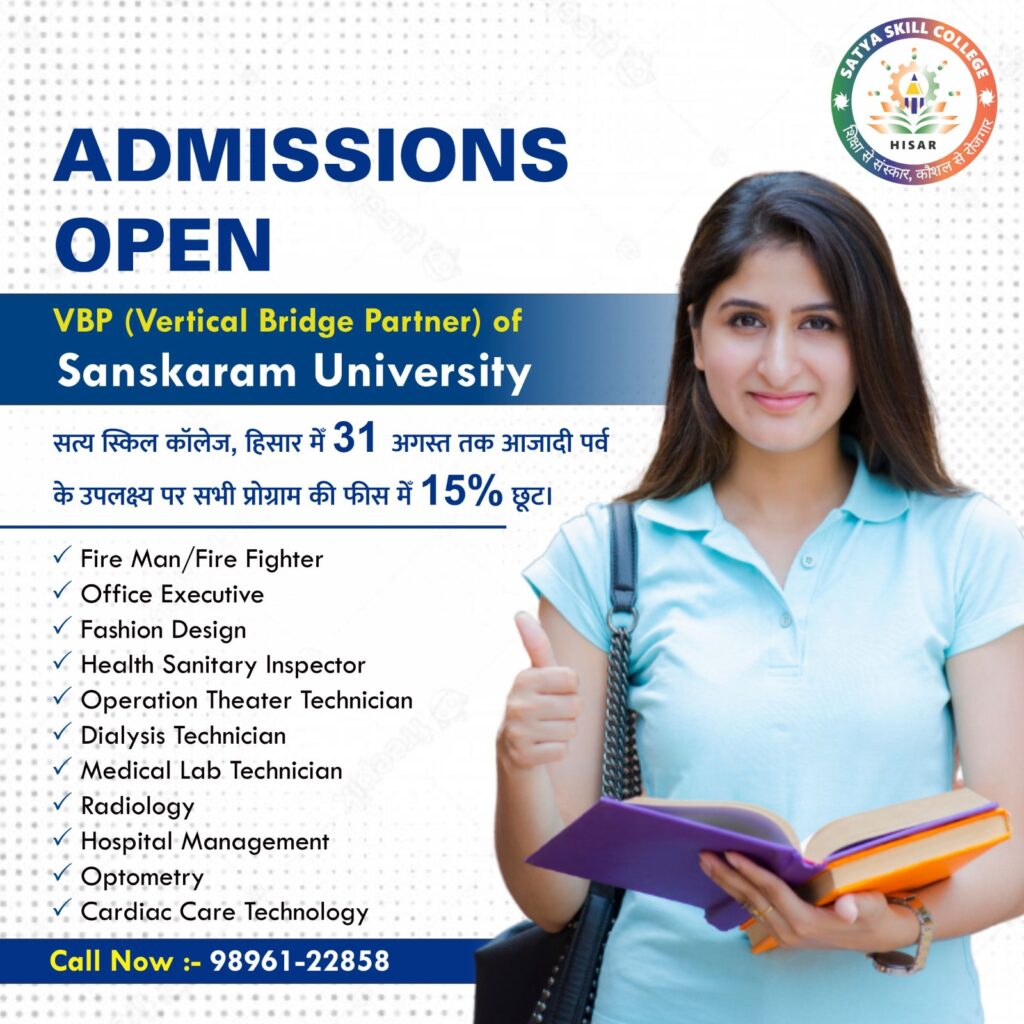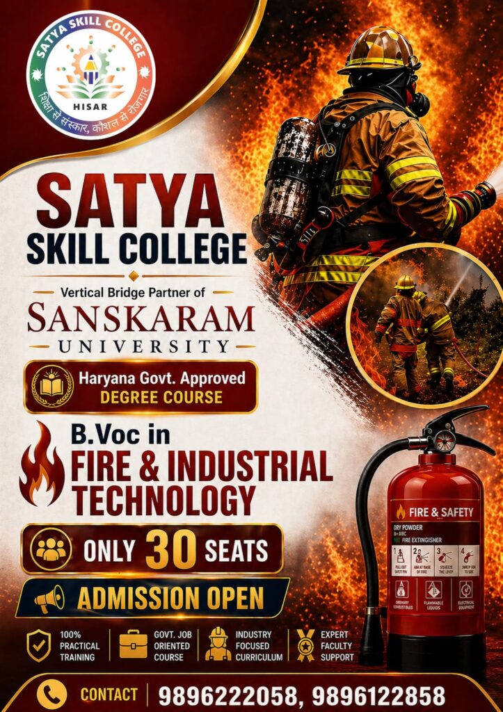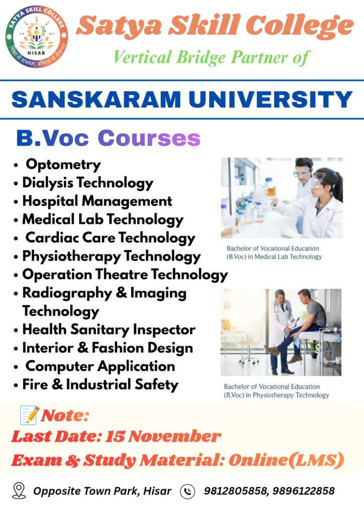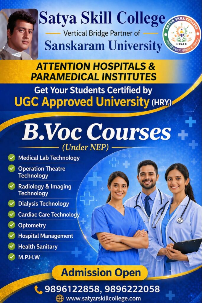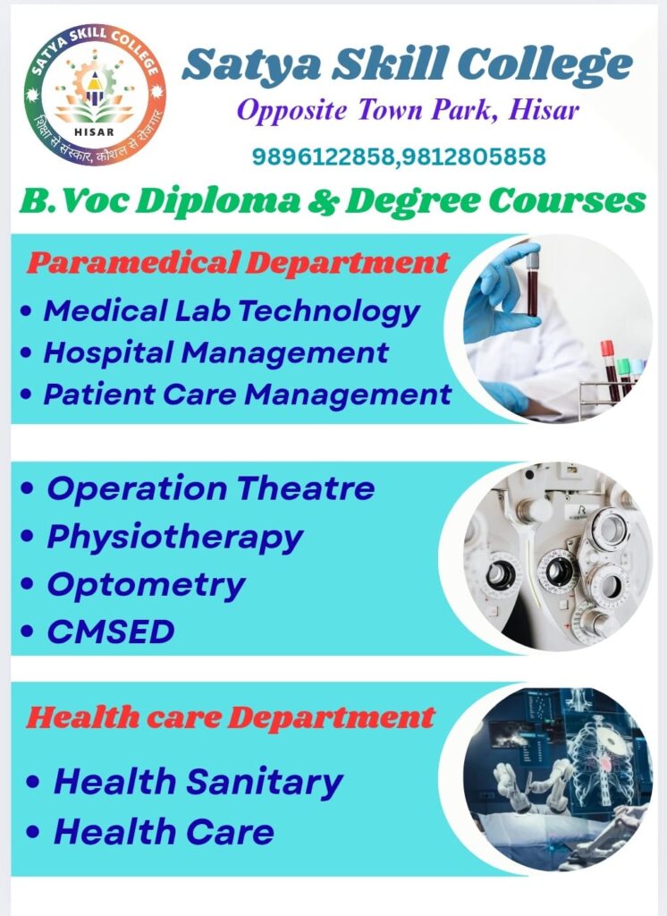 Satya Skill College in Hisar is run by the “Master Satyanarain Education Society” (Regd), stands as a tribute to the late Satyanarain Aggarwal, aimed at empowering youth through education and skill development. In today’s competitive landscape, it plays a pivotal role in not just imparting knowledge but also equipping students with practical training crucial for employment opportunities. Aligned with the new education policies of the Indian government, the college emphasizes Vocational Certificate,Diploma and degree like Business Accounting & Finance, Paramedical and Health care, Hospital management, Computer applications, Fashion Designing & Interior Designing, Yoga. Students are well-prepared for self-employment or successful integration into relevant industries.